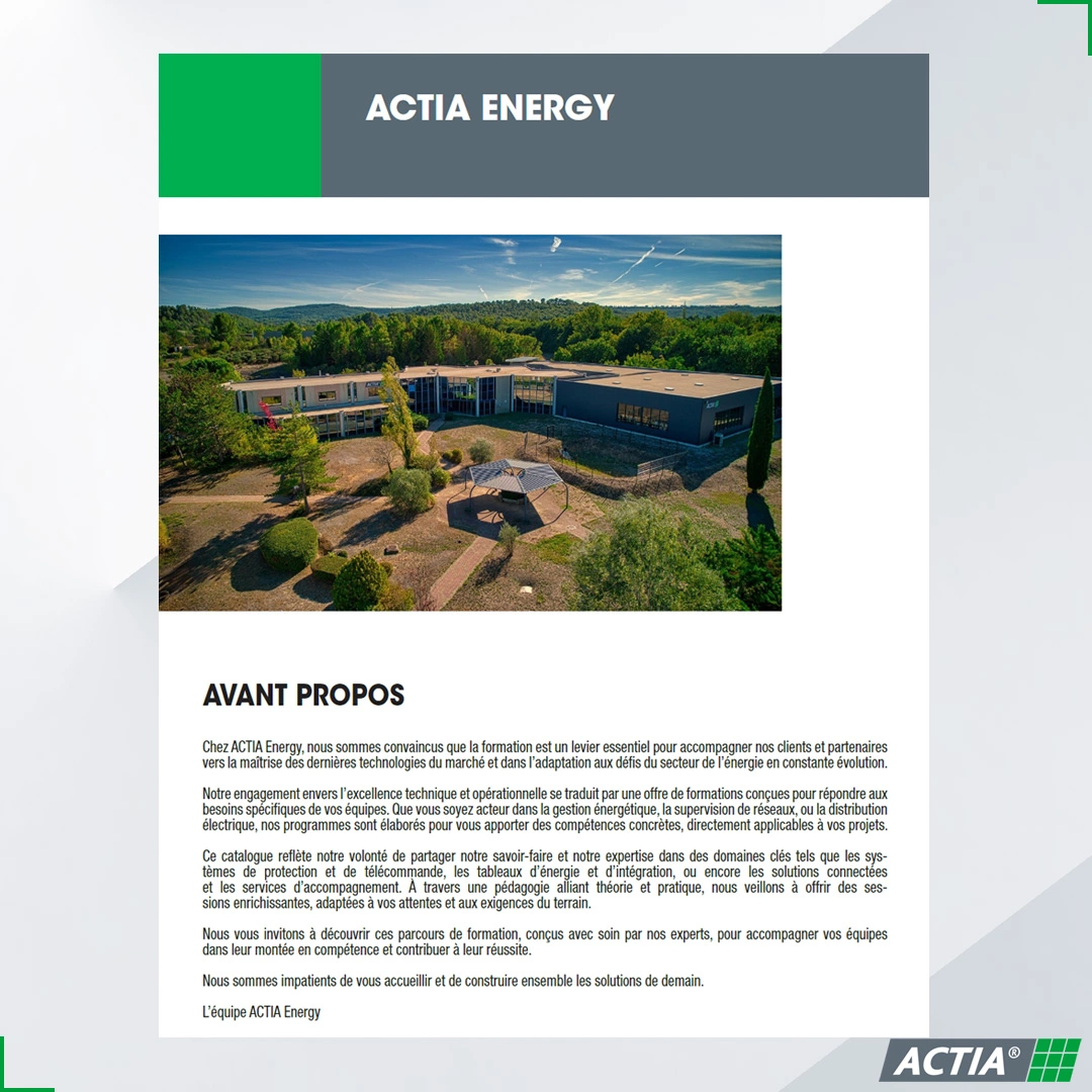 El catálogo de formación ACTIA Energy ofrece una amplia gama de cursos destinados a los profesionales del sector energético, abarcando sistemas de supervisión, gestión de redes eléctricas, ciberseguridad y electrotecnia.